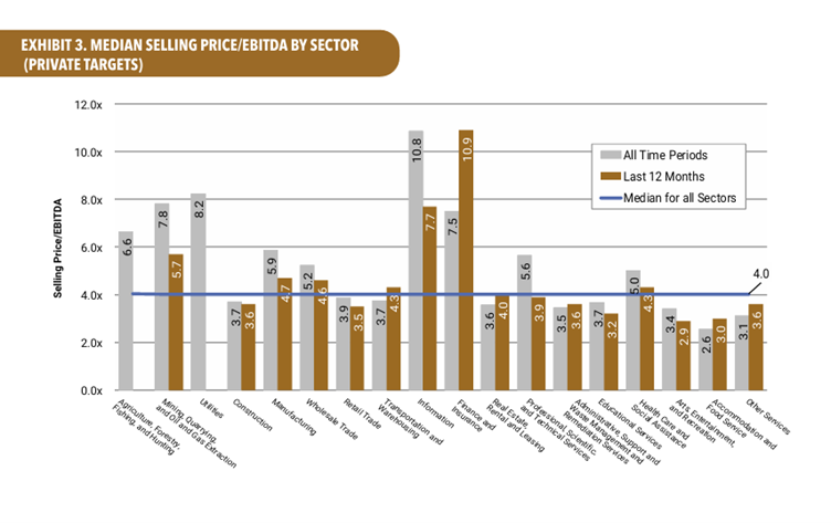 The monthly BVR statistics usually tell a similar story when they are published. Namely, that companies being sold in most sectors achieve relatively low multiples of EBITDA. This is with the exception of financial services and information technology, both of which are replete with businesses that have highly scalable (because IT driven) and high margin businesses. Such businesses mean that even if high multiples are paid on acquisition, shortly thereafter the acquiror can scale them up and still get that magical payback the board will be demanding.